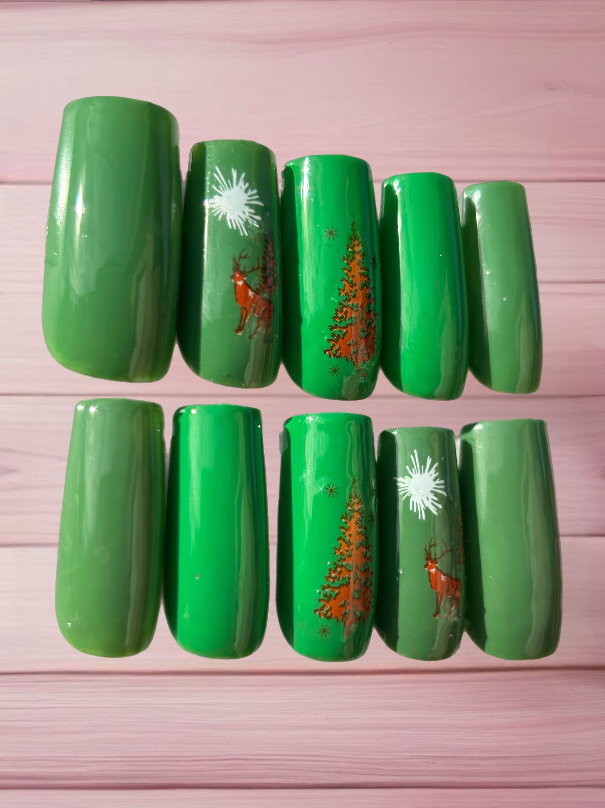 Step into a classic Christmas dream with our 'Forest Wonderland' set! Rich evergreen nails adorned with playful reindeer and charming Christmas trees evoke cozy nights and festive cheer. Perfect for those who love traditional holiday magic with a touch of rustic elegance. Includes a touch of shimmering green glitter for that extra sparkle